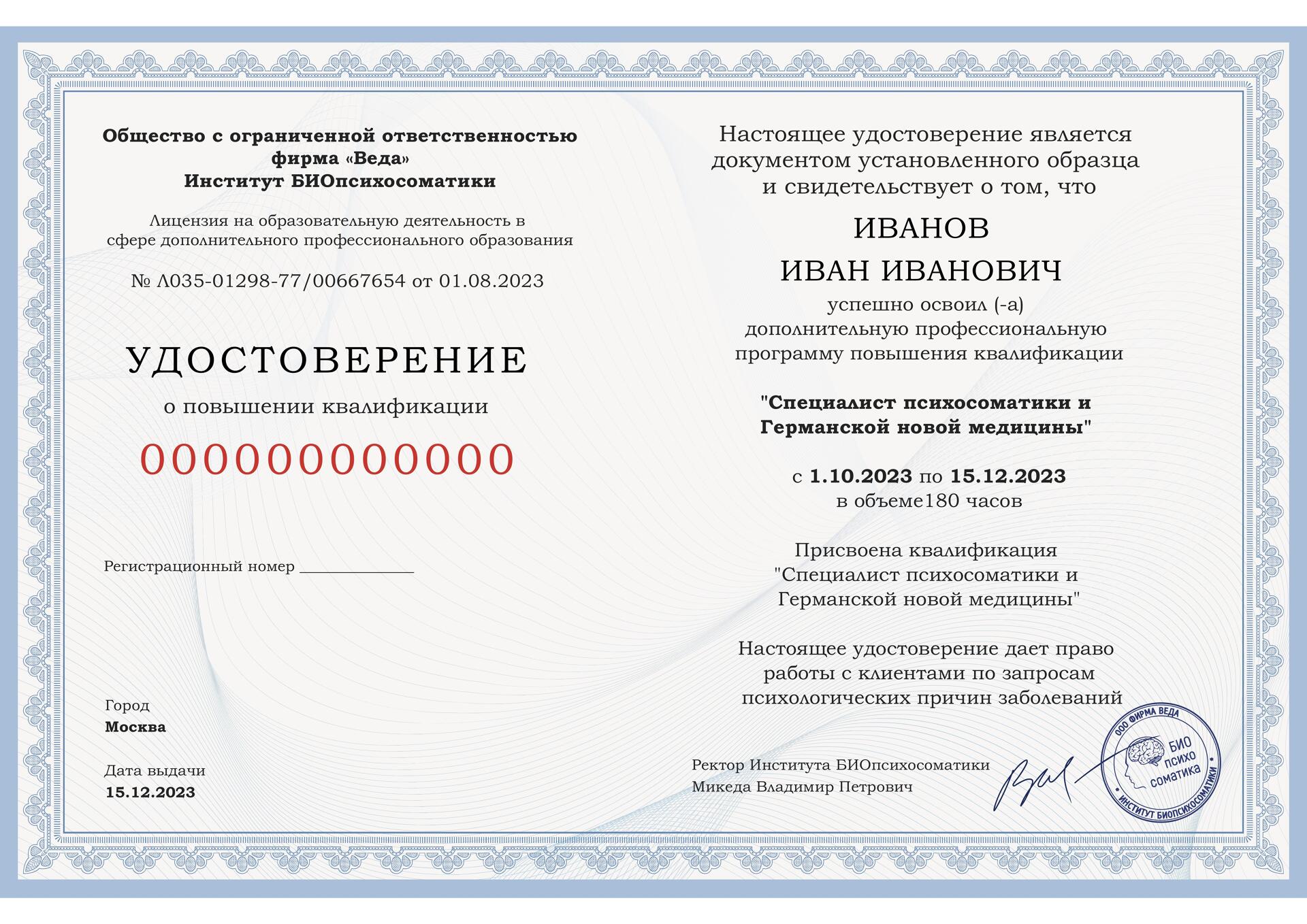 Удостоверение о повышении квалификации установленного образца с присвоением квалификации «Специалист психосоматики и Германской новой медицины»