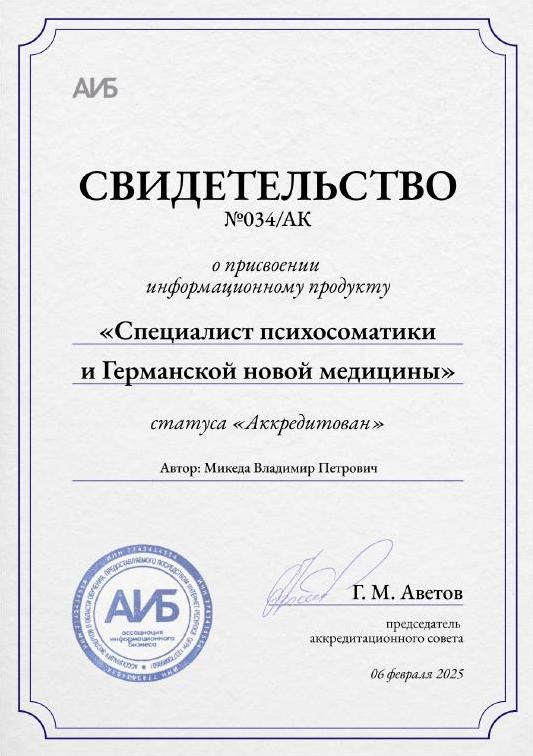 Курс “Специалист психосоматики и Германской новой медицины” прошел независимую экспертизу информационного продукта. Подтверждено соответствие качества информационного продукта аккредитационным показателям и присвоен статус “АККРЕДИТОВАН”.